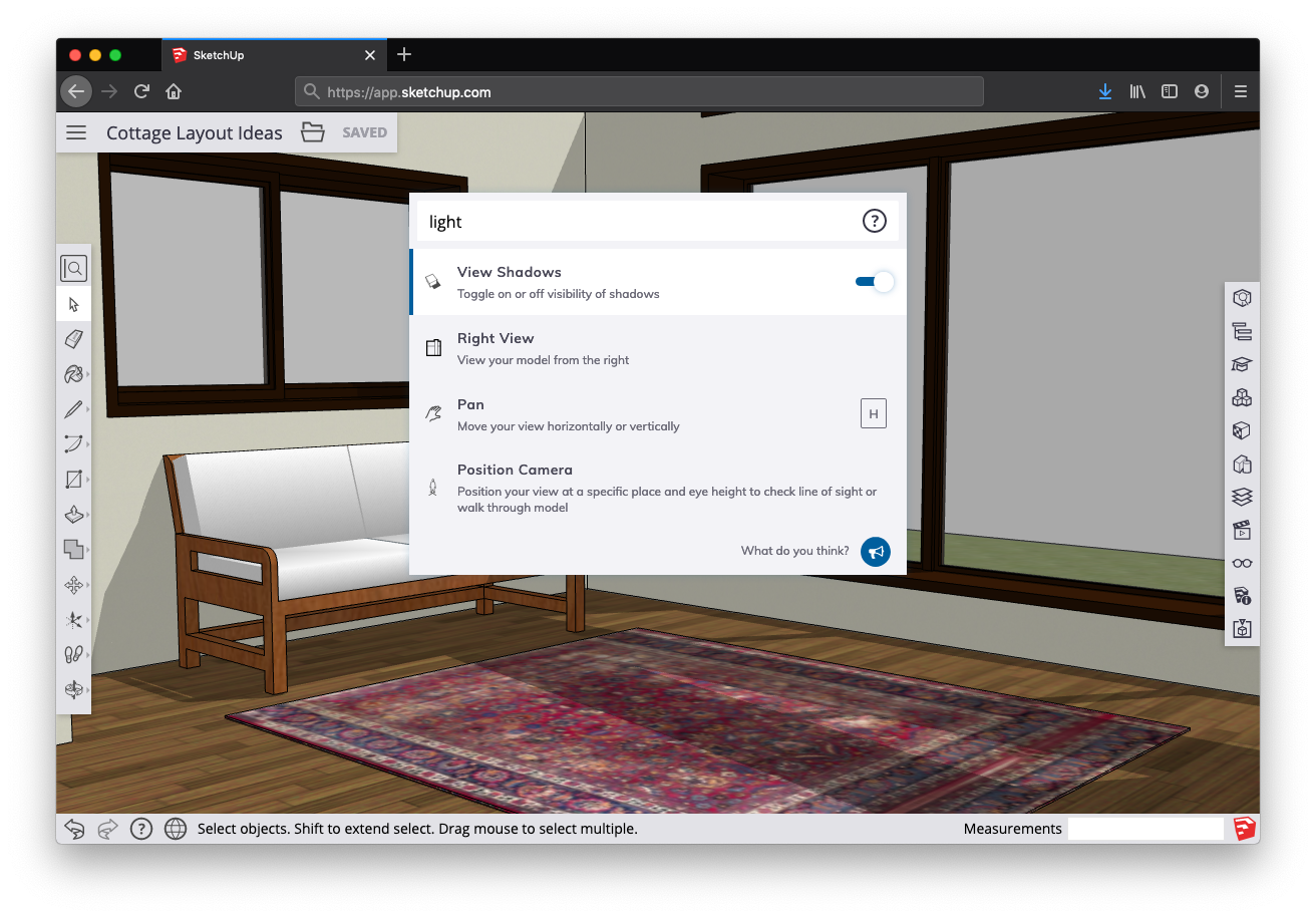 Tìm kiếm Concept chắc chắn là chủ quan, vì vậy chúng tôi rất thích thú với feedback của người dùng về việc làm cách nào để tìm kiếm các hoạt động trong SketchUp for Web. Chúng tôi có thêm một số lệnh để thêm vào chỉ mục của mình – và dự định sẽ hỗ trợ nhiều ngôn ngữ hơn – vì vậy phản hồi của các bạn thực sự có thể giúp chúng tôi tăng cường khả năng tìm kiếm trong phiên bản SketchUp for Web (trước khi nó xuất hiện trên các sản phẩm khác của SketchUp).