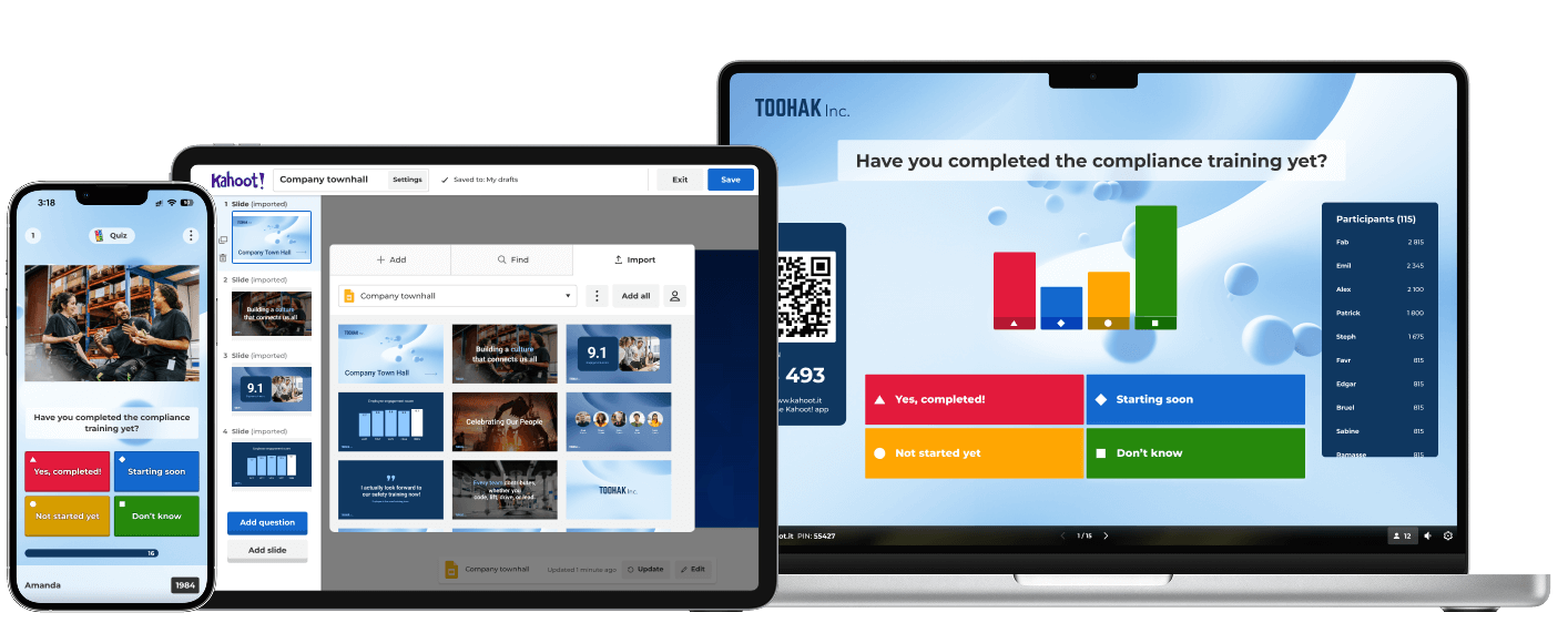 Tổ chức một trò chơi trực tiếp với các câu hỏi trên màn hình lớn hoặc chia sẻ trò chơi với những người chơi từ xa.