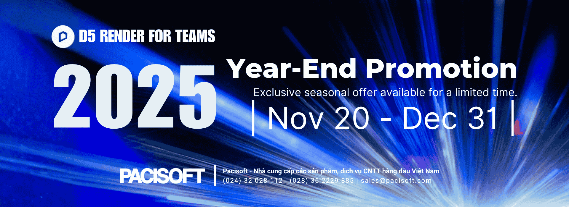 Tại Việt Nam, chương trình được phân phối thông qua PACISOFT, đại lý ủy quyền chính thức của D5 render, mang đến cơ hội sở hữu D5 Render for Teams với mức giá ưu đãi đặc biệt trong thời gian có hạn.