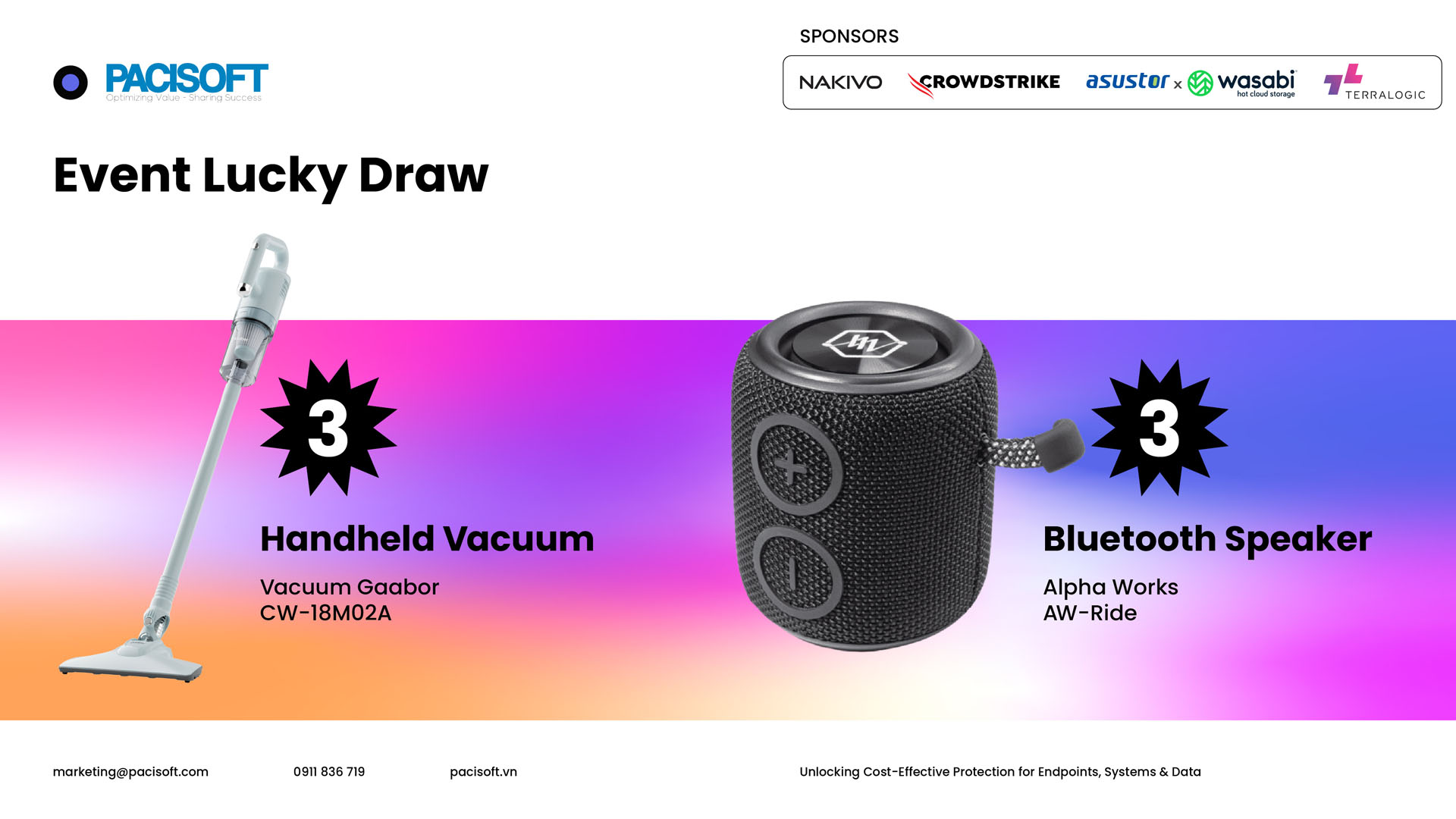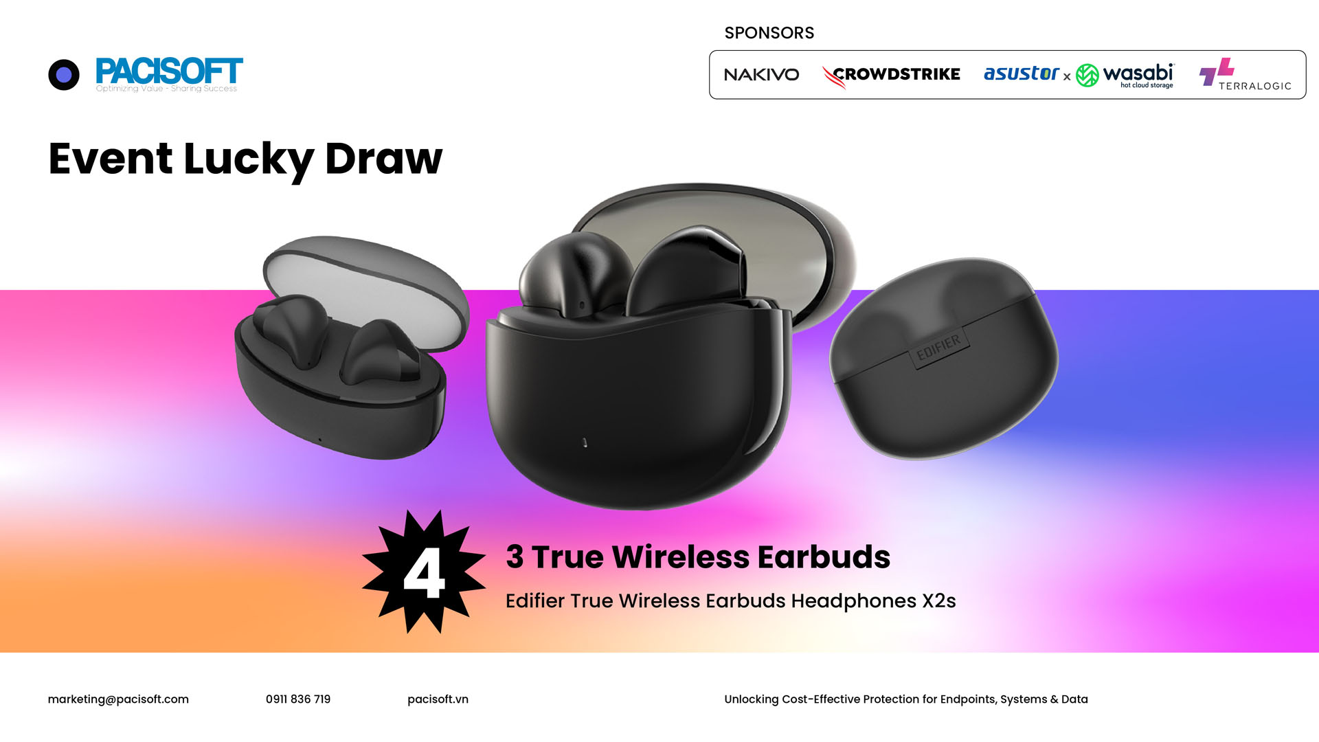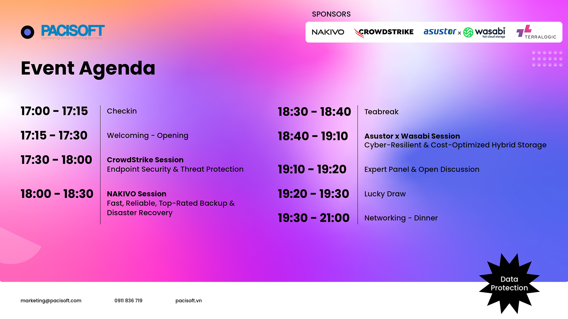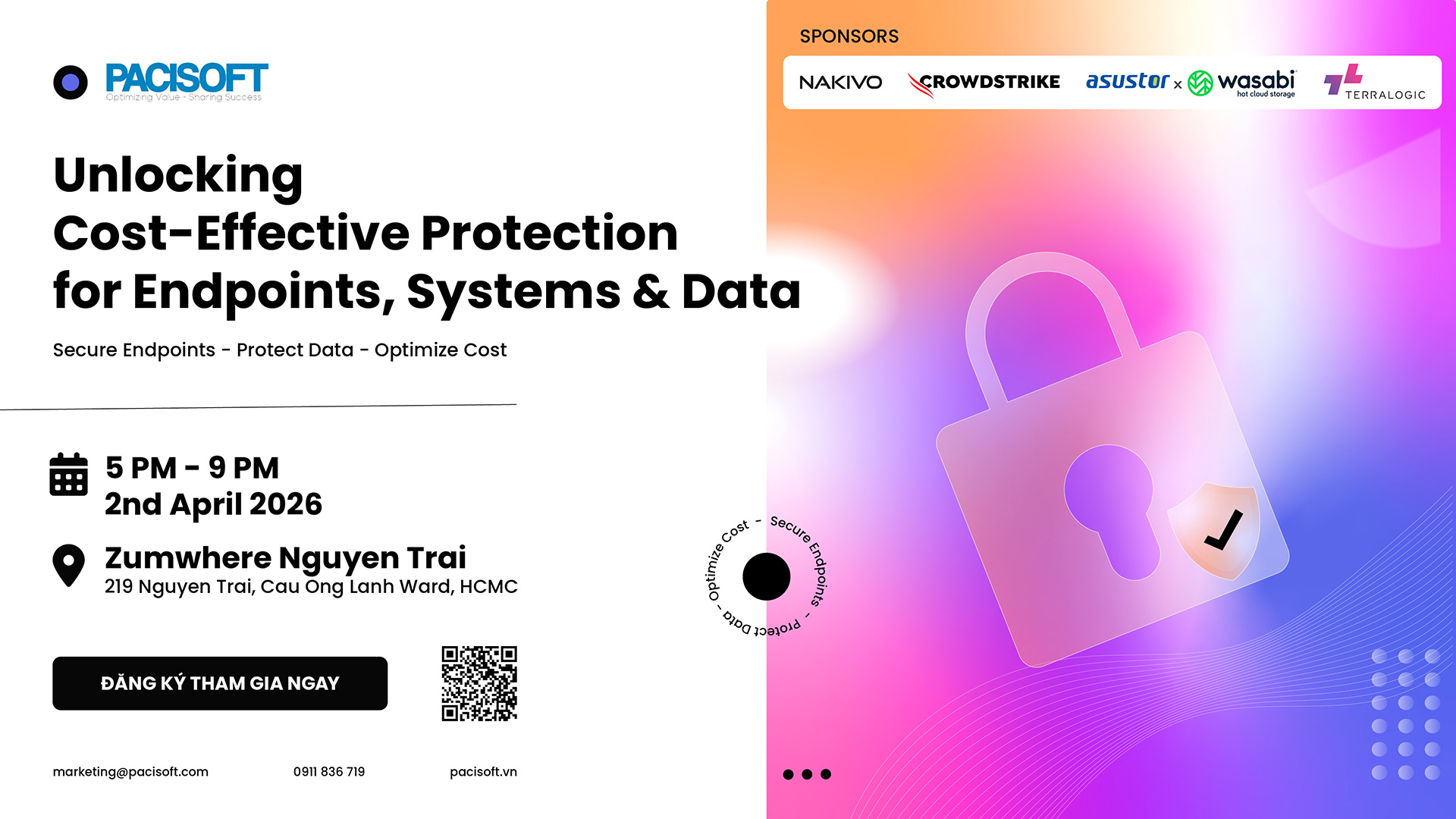 Sự kiện sẽ giới thiệu những giải pháp giúp doanh nghiệp xây dựng chiến lược bảo mật và bảo vệ dữ liệu toàn diện, từ Endpoint Security, Backup & Disaster Recovery đến Hybrid Storage với chi phí tối ưu. Đây là sự kiện về giải pháp bảo mật tân tiến nhất được tổ chức bởi PACISOFT, Nakivo, CrowdStrike, Asustor x Wasabi và Terralogic.
