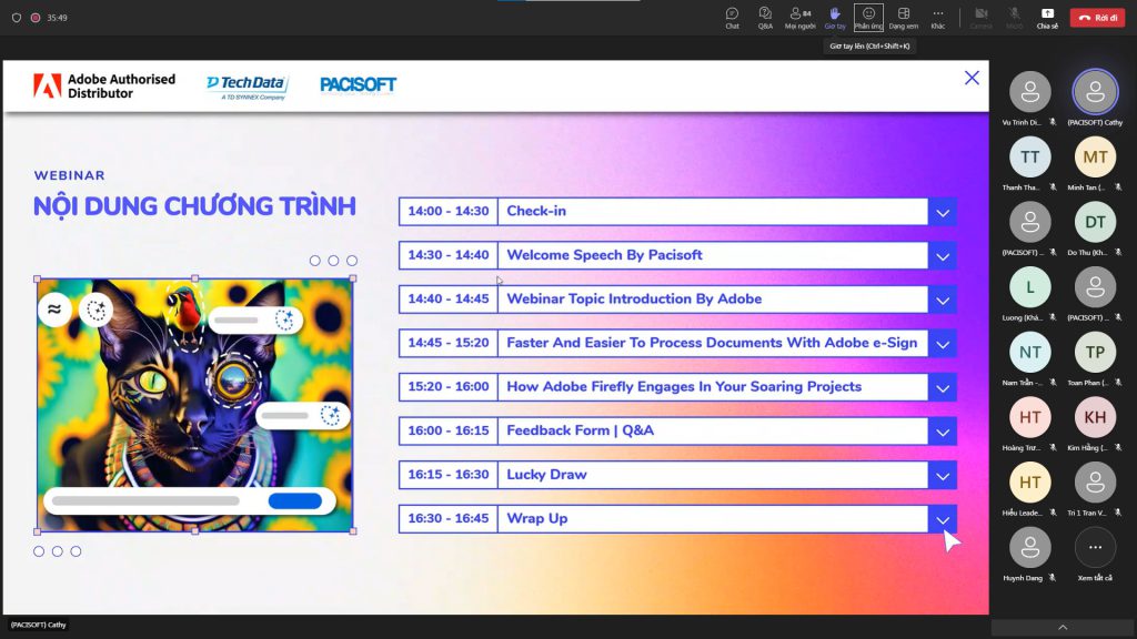 Trong kỷ nguyên thiết kế đồ họa được hỗ trợ bởi AI ngày nay; vào ngày 15.11.2023, Pacisoft đã hợp tác cùng Adobe và Tech Data đồng tổ chức buổi hội thảo trực tuyến “Unlocking the power of AI with Adobe Creative Cloud” nhằm giúp Quý Khách hàng cập nhật những xu hướng và tính năng mới nhất kết hợp AI trong Adobe Firefly và Adobe e-Sign.