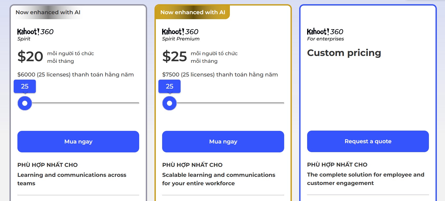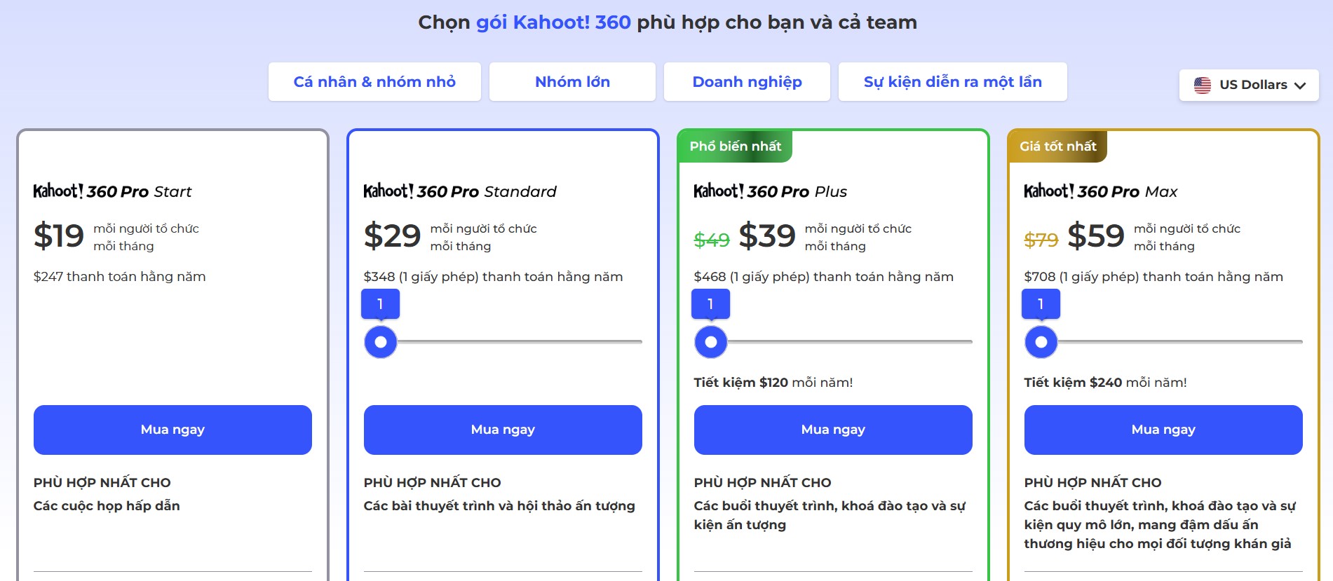 Tuy nhiên, nhu cầu sử dụng ngày càng đa dạng đã khiến việc chọn đúng gói tài khoản Kahoot! trở nên quan trọng hơn bao giờ hết. Phiên bản miễn phí tuy phù hợp cho người dùng cá nhân hoặc lớp học nhỏ, nhưng lại hạn chế về số lượng người tham gia, tính năng báo cáo hay tùy chỉnh nội dung. Trong khi đó, các gói Kahoot! 360 dành cho năm 2025 mang đến nhiều lựa chọn linh hoạt hơn, phù hợp cho giáo viên, nhóm học tập, hay cả doanh nghiệp lớn cần đào tạo và kết nối đội ngũ.