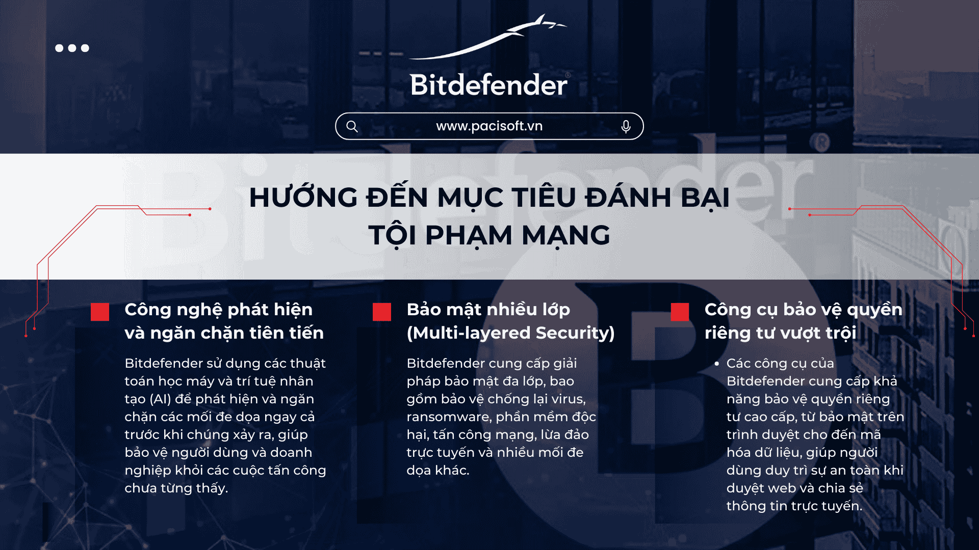 Bitdefender cung cấp các giải pháp an ninh mạng hàng đầu, với hiệu quả bảo mật, hiệu suất cao và dễ sử dụng, phục vụ cho các doanh nghiệp vừa và nhỏ, doanh nghiệp tầm trung cũng như người tiêu dùng. Được định hướng bởi tầm nhìn trở thành nhà cung cấp giải pháp an ninh mạng đáng tin cậy nhất thế giới, Bitdefender cam kết bảo vệ các tổ chức và cá nhân trên toàn cầu trước các mối đe dọa mạng, giúp họ chuyển đổi và cải thiện trải nghiệm kỹ thuật số một cách an toàn và hiệu quả.