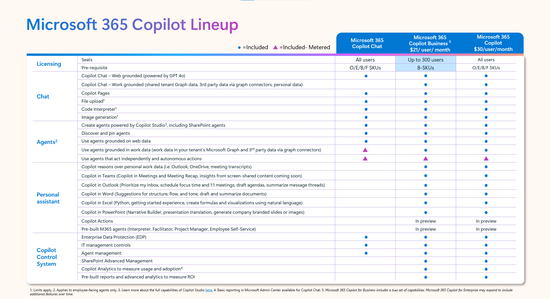 Điểm khác biệt chính nằm ở đối tượng sử dụng và mô hình cấp phép. Copilot Business được Microsoft thiết kế dành riêng cho doanh nghiệp vừa và nhỏ (tối đa 300 người dùng) đang sử dụng Microsoft 365 Business, với mức chi phí và cách đóng gói phù hợp hơn cho quy mô này. Trong khi đó, Microsoft 365 Copilot ($30) hướng đến các doanh nghiệp lớn sử dụng bộ Microsoft 365 Enterprise.